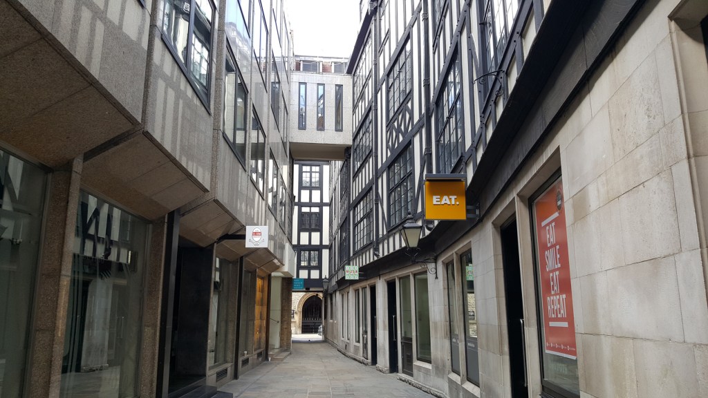 After a short walk from Moorgate Underground along the beautiful Mason’s Avenue, a bustling little food/pub avenue in pre-corona workdays, now quiet on a cloudy Sunday evening.